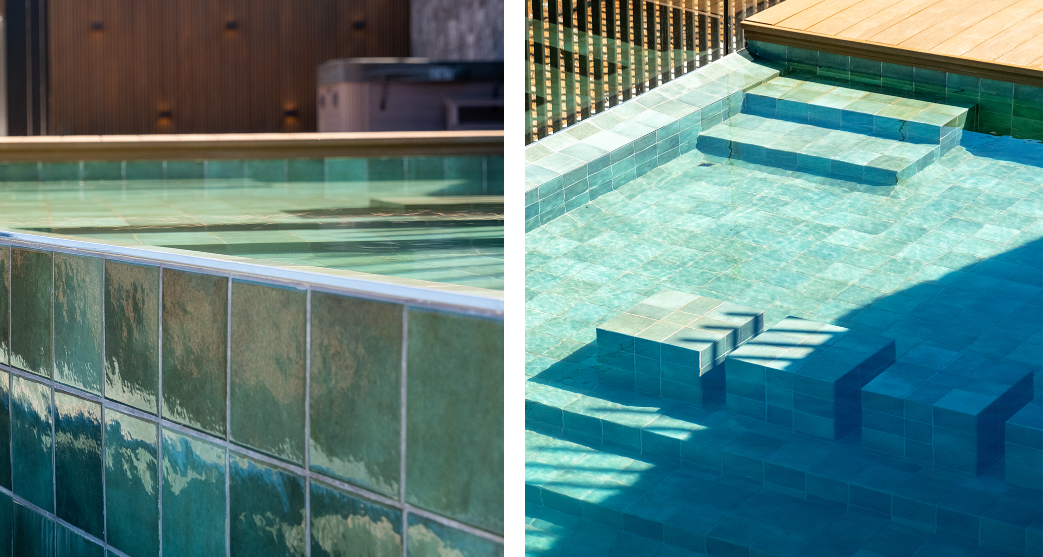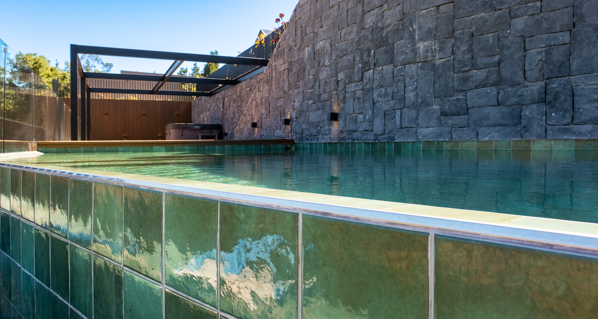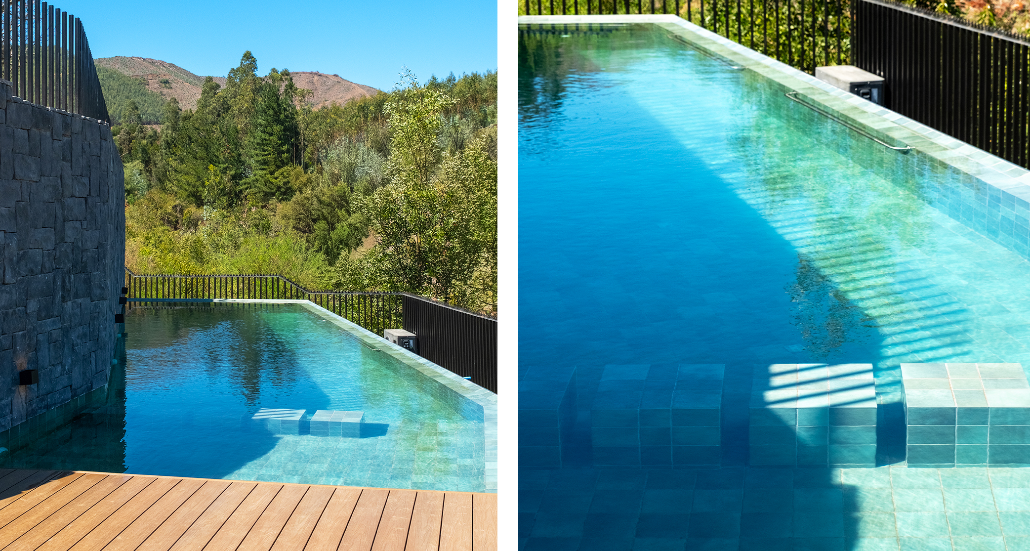 La elección del color fue igualmente relevante. El tono verde permite que la piscina se integre de forma natural con el entorno, estableciendo un diálogo con el bosque, la piedra volcánica y la madera del deck. Más que un elemento protagónico, el agua pasa a ser parte de un conjunto donde arquitectura y paisaje se equilibran.